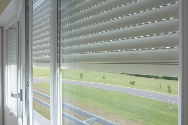 Moderne und robuste Raffstores bieten den optimalen Sonnen-, Blend- und Sichtschutz. Trotz Sichtschutz haben Sie immer freie Sicht nach außen. Durch eine stufenlose Veränderung des Neigungswinkels der Lamellen können Sie den Lichteinlass selber steuern. Deshalb ideal geeignet für große Fensterfassaden, z.B. an Bürogebäuden.